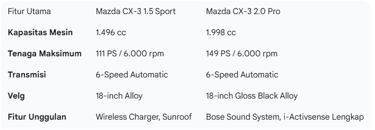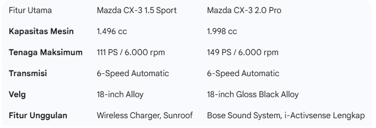 Selamat datang di era baru berkendara dengan Mazda CX-3. Sebagai Compact SUV terbaik di kelasnya, Mazda CX-3 hadir memenuhi impian para profesional muda dan keluarga aktif yang menginginkan mobil dengan tampilan elegan namun tetap tangguh. Dengan filosofi Less is More, Mazda menghadirkan garis bodi yang dinamis, interior mewah, dan fitur keselamatan mutakhir i-Activsense.
